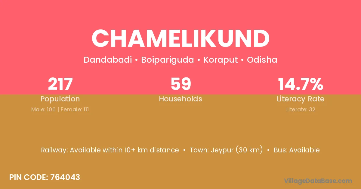 Jeypur (30 km) is the nearest town to Chamelikund village for major economic activities and is located approximately 30 km away.