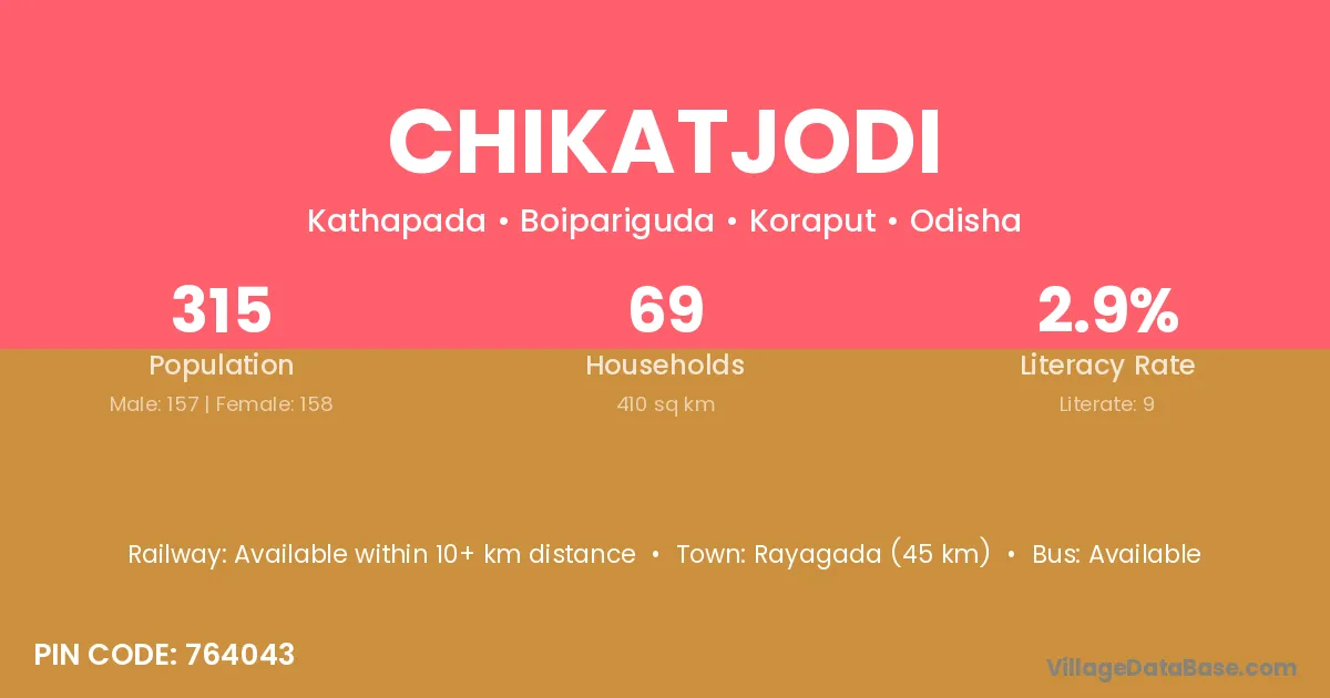 Rayagada (45 km) is the nearest town to Chikatjodi village for major economic activities and is located approximately 45 km away.