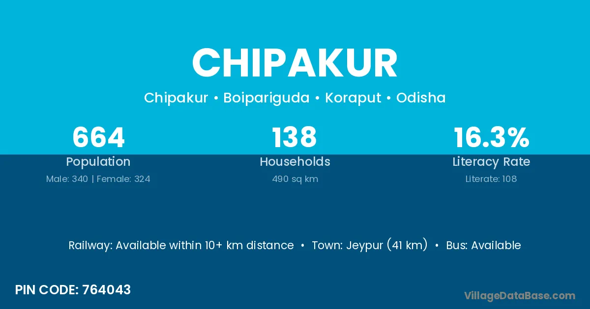 Jeypur (41 km) is the nearest town to Chipakur village for major economic activities and is located approximately 41 km away.