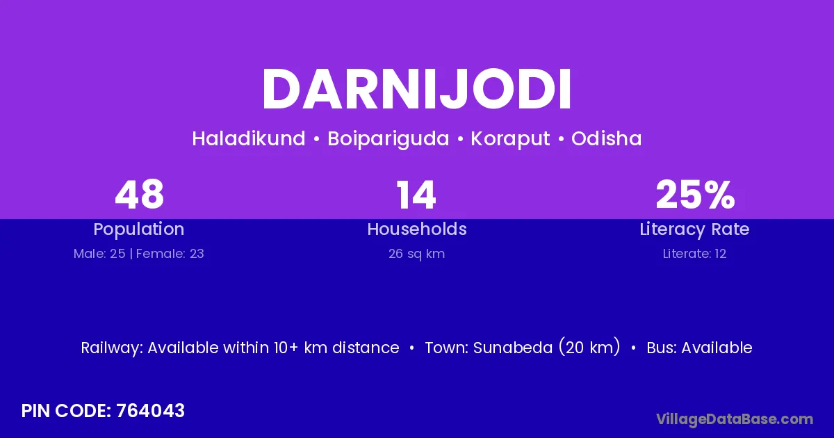 Sunabeda (20 km) is the nearest town to Darnijodi village for major economic activities and is located approximately 20 km away.