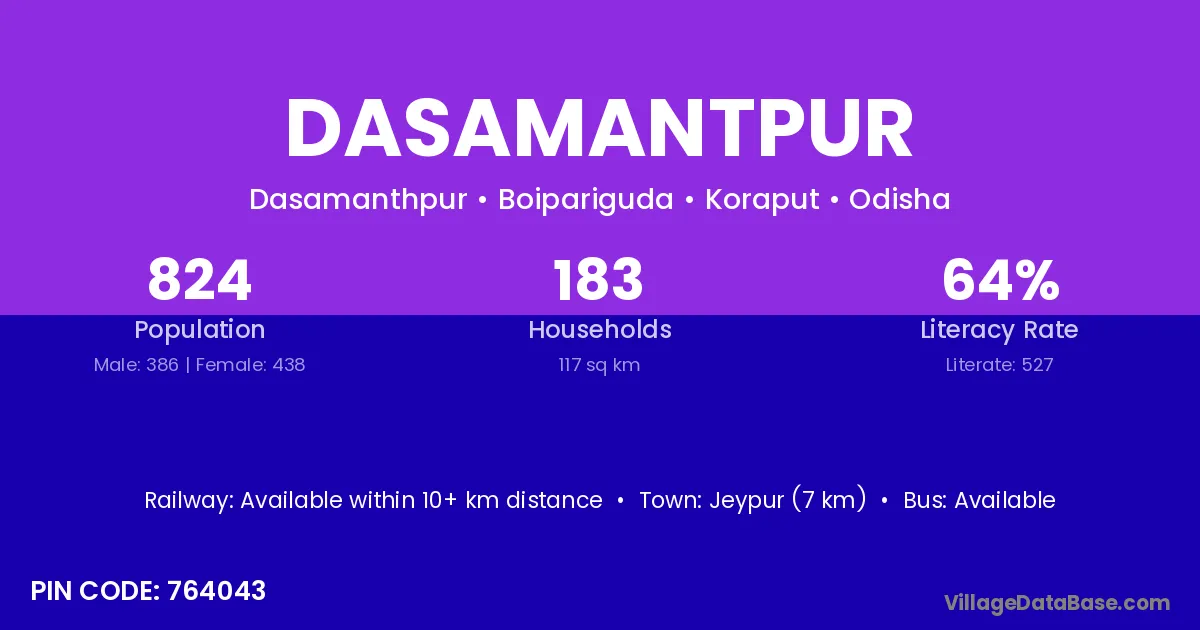 Jeypur (7 km) is the nearest town to Dasamantpur village for major economic activities and is located approximately 7 km away.