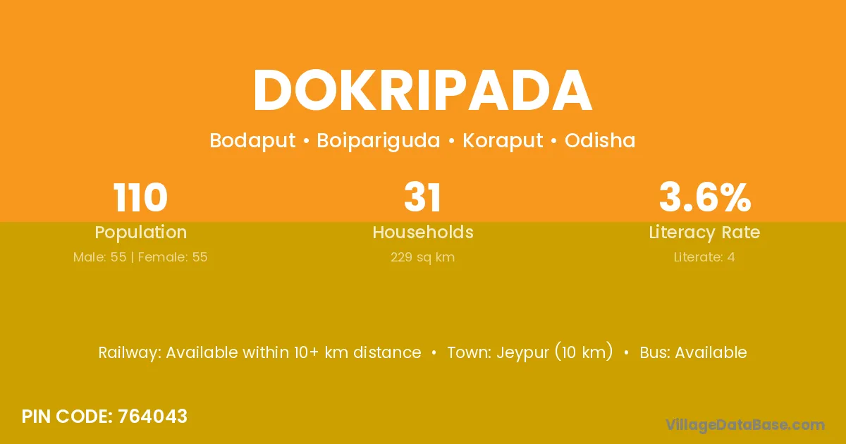 Jeypur (10 km) is the nearest town to Dokripada village for major economic activities and is located approximately 10 km away.