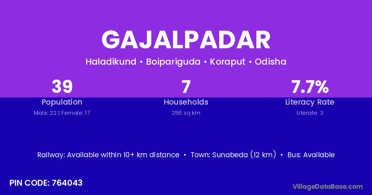 Sunabeda (12 km) is the nearest town to Gajalpadar village for major economic activities and is located approximately 12 km away.