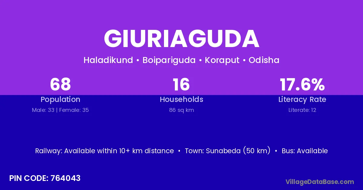 Sunabeda (50 km) is the nearest town to Giuriaguda village for major economic activities and is located approximately 50 km away.