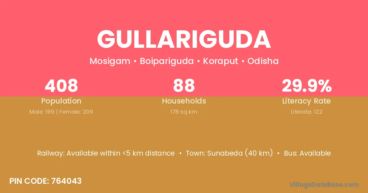 According to Census 2011 information, the village code of Gullariguda village is 764043.