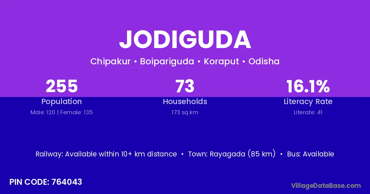 Rayagada (85 km) is the nearest town to Jodiguda village for major economic activities and is located approximately 85 km away.