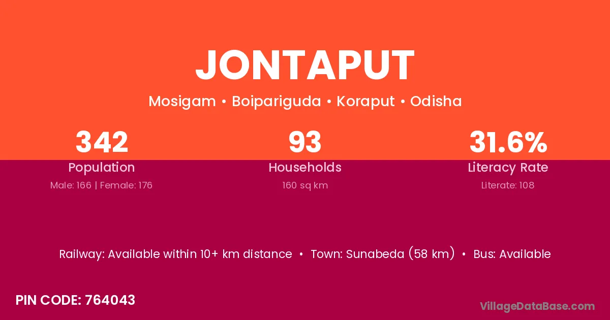 Sunabeda (58 km) is the nearest town to Jontaput village for major economic activities and is located approximately 58 km away.