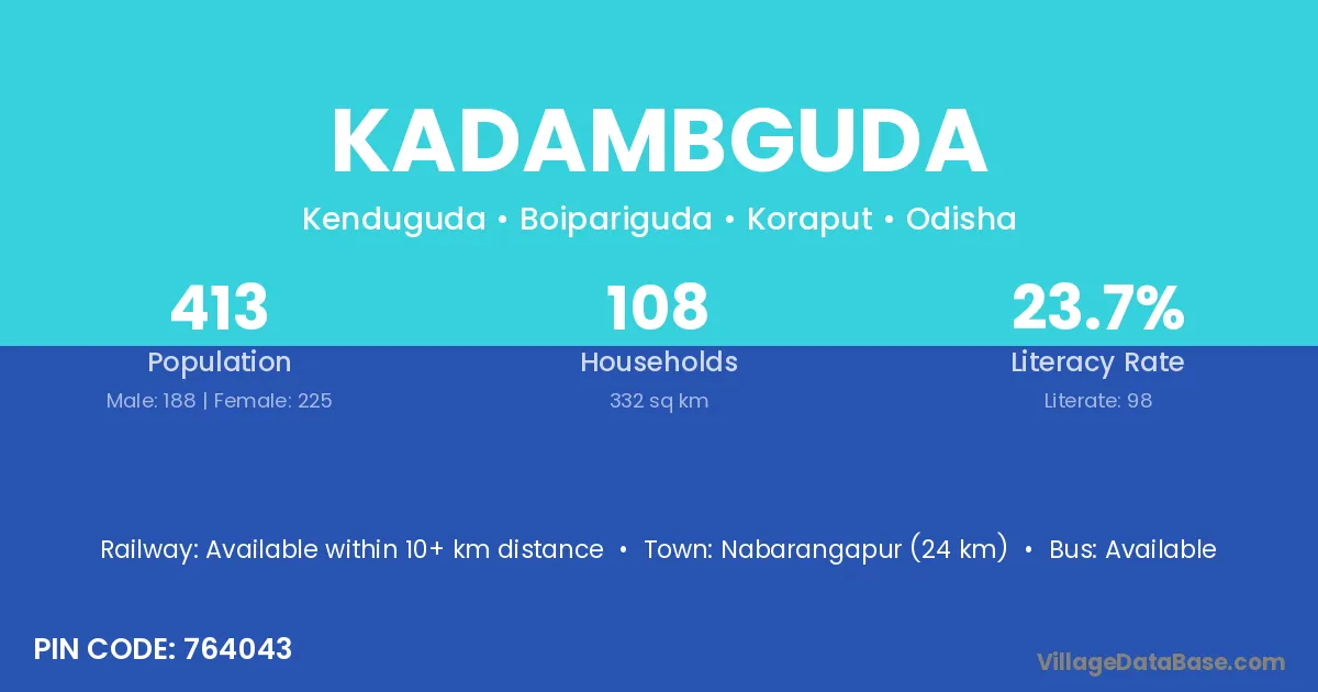 Nabarangapur (24 km) is the nearest town to Kadambguda village for major economic activities and is located approximately 24 km away.