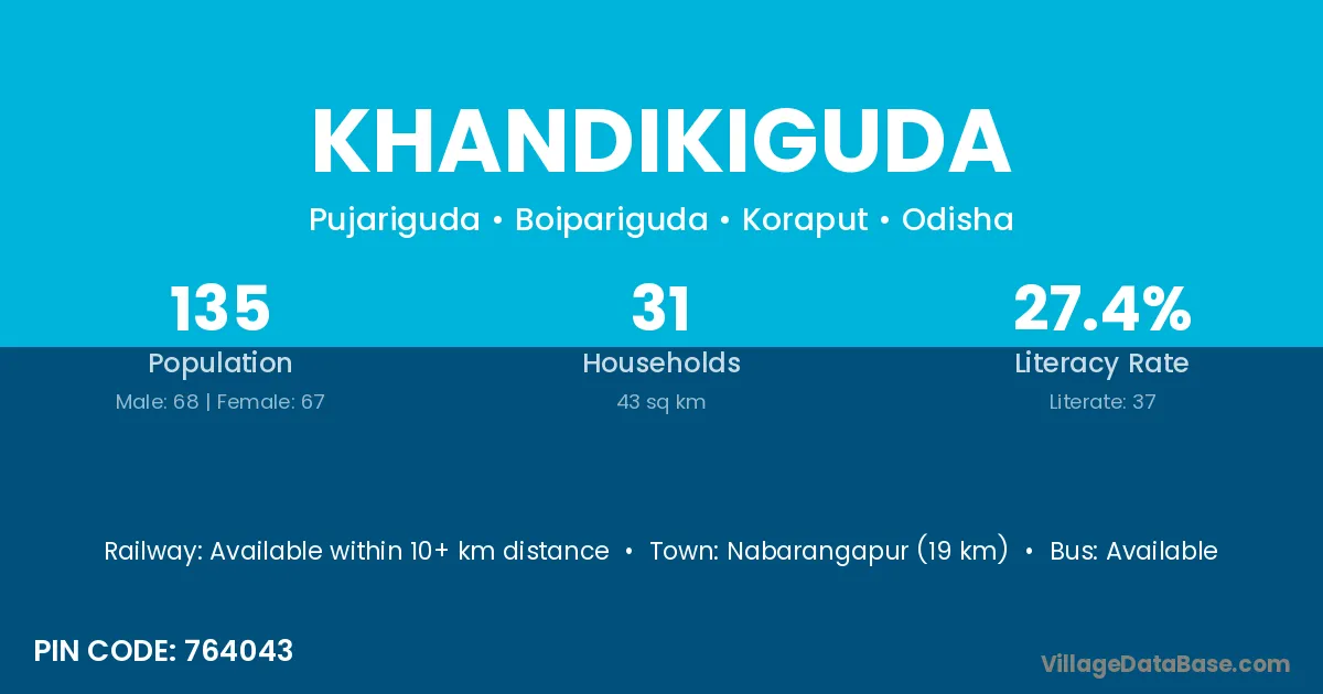 Khandikiguda village has a total population of 135 people, of which 68 are males and 67 are females.