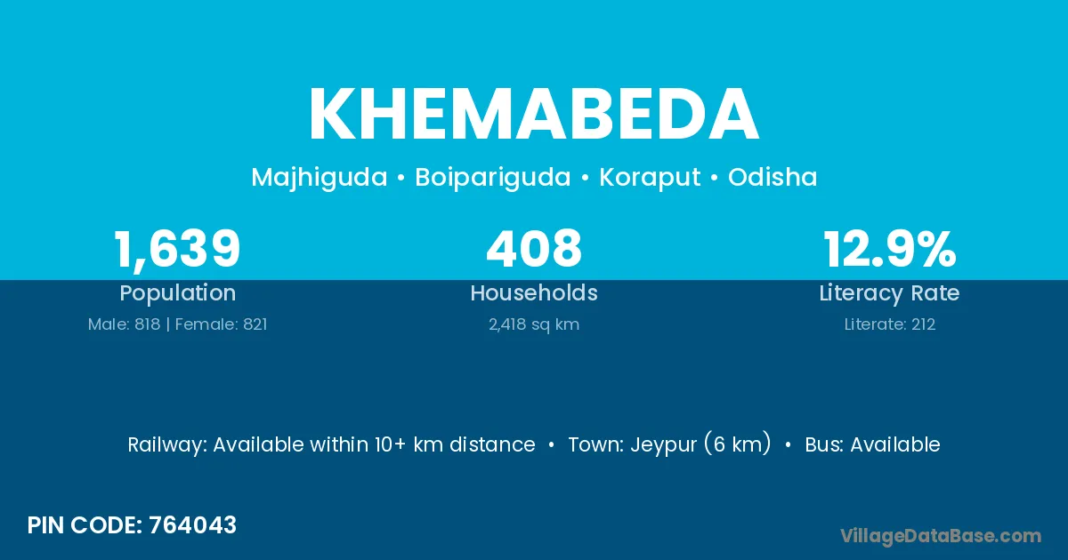 Jeypur (6 km) is the nearest town to Khemabeda village for major economic activities and is located approximately 6 km away.