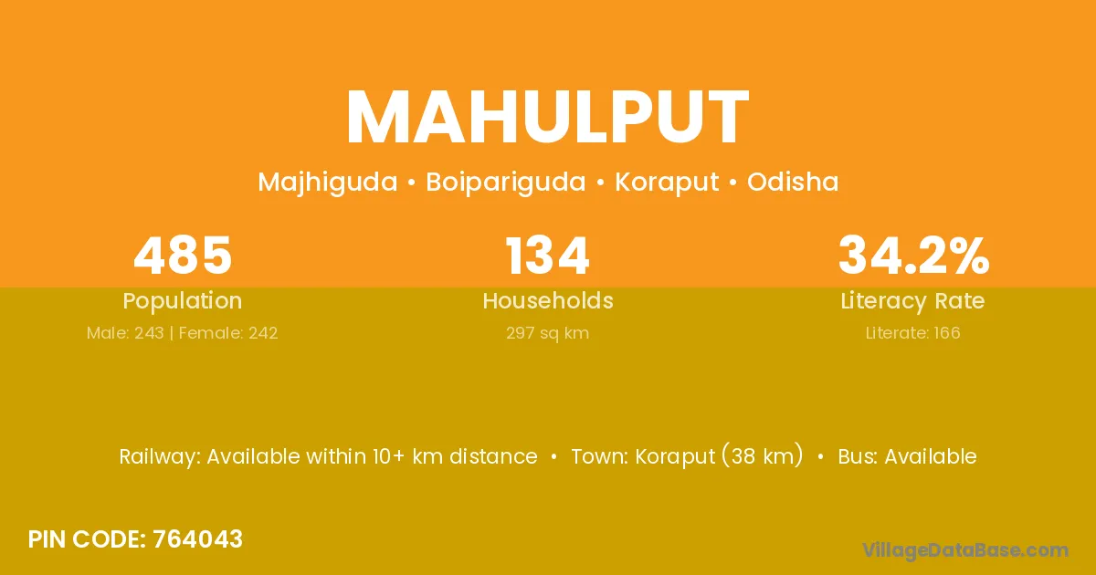 Koraput (38 km) is the nearest town to Mahulput village for major economic activities and is located approximately 38 km away.