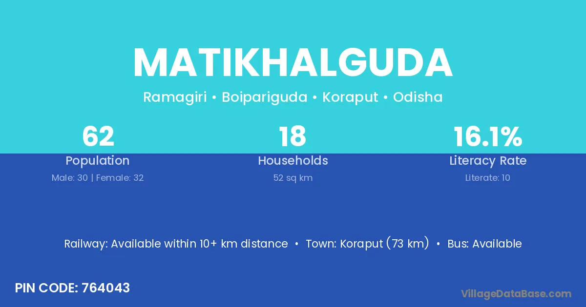 Koraput (73 km) is the nearest town to Matikhalguda village for major economic activities and is located approximately 73 km away.