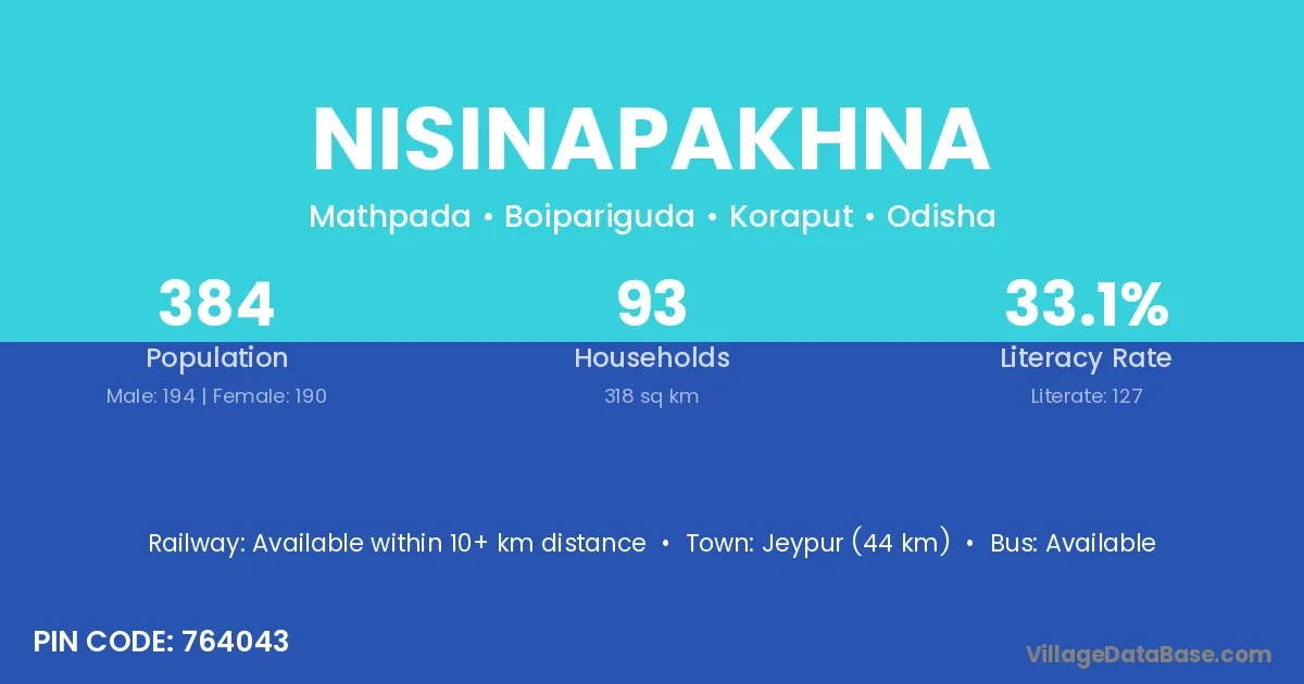 Jeypur (44 km) is the nearest town to Nisinapakhna village for major economic activities and is located approximately 44 km away.