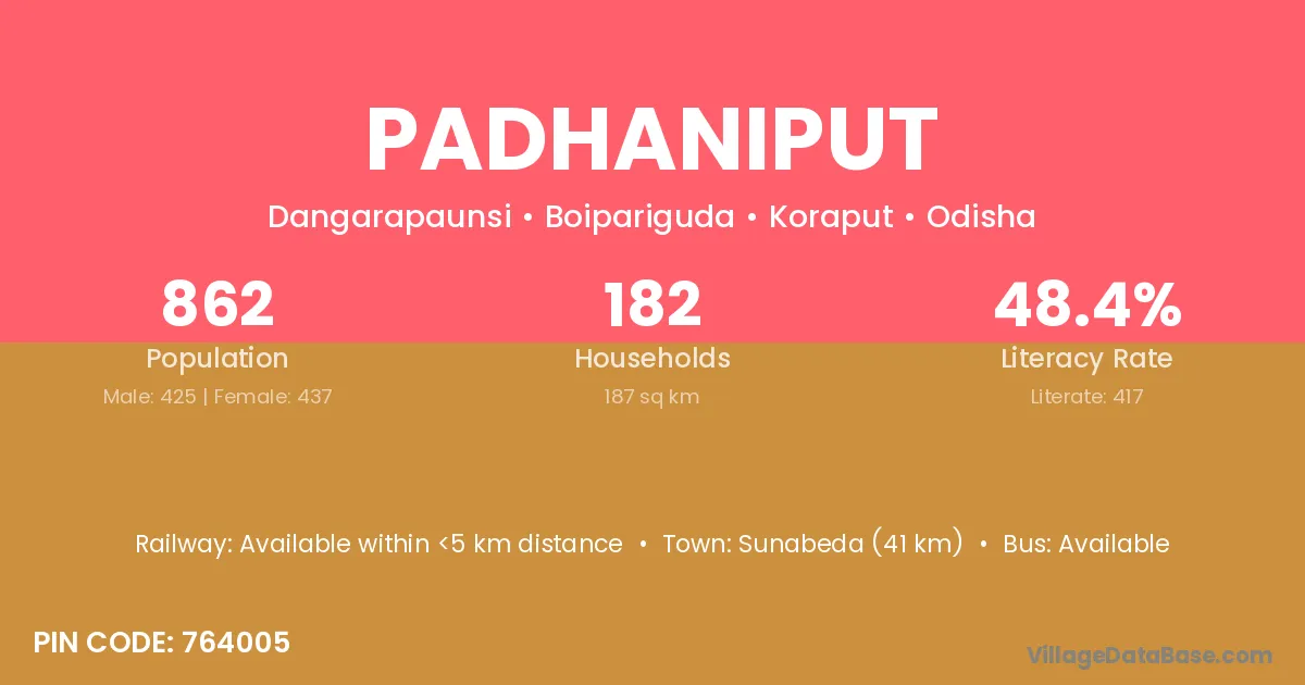 Sunabeda (41 km) is the nearest town to Padhaniput village for major economic activities and is located approximately 41 km away.
