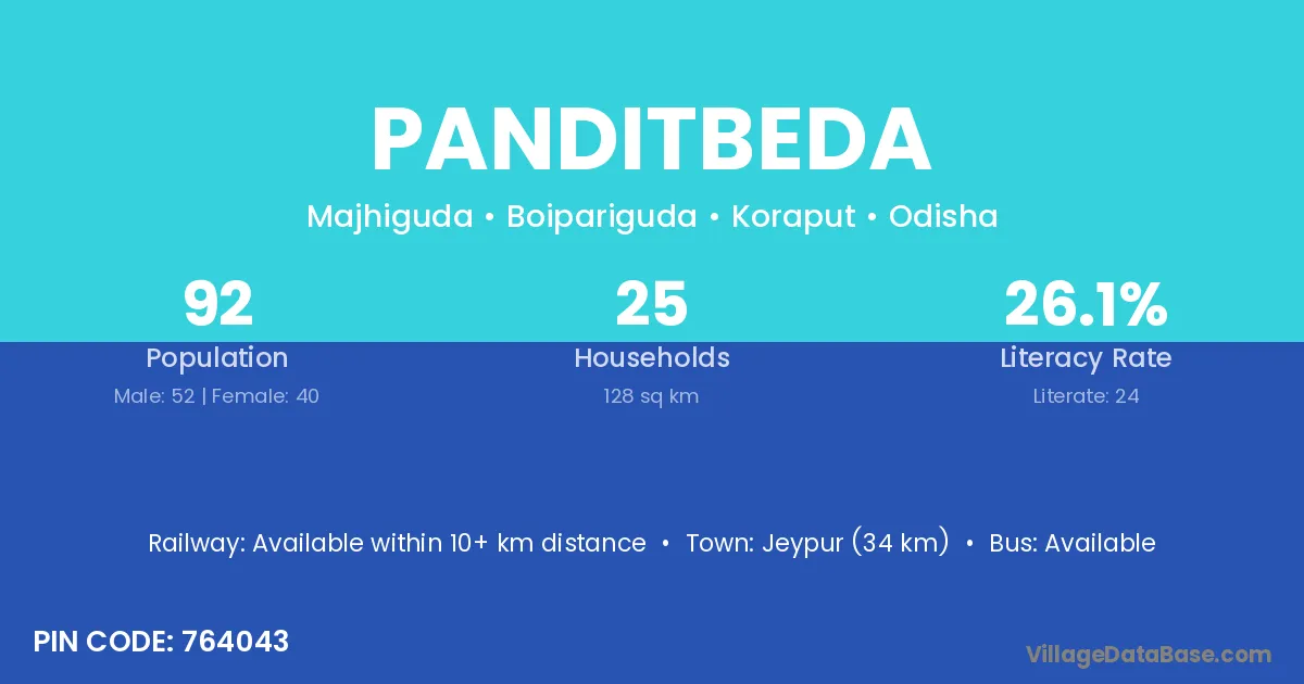 Jeypur (34 km) is the nearest town to Panditbeda village for major economic activities and is located approximately 34 km away.