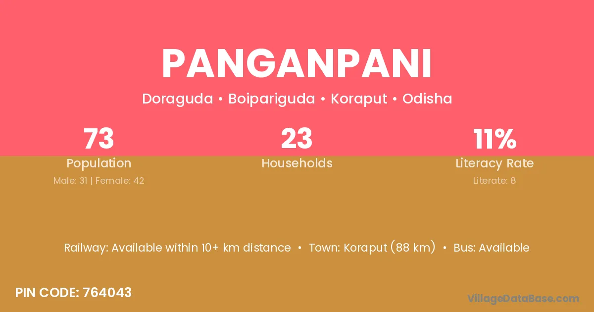 Koraput (88 km) is the nearest town to Panganpani village for major economic activities and is located approximately 88 km away.