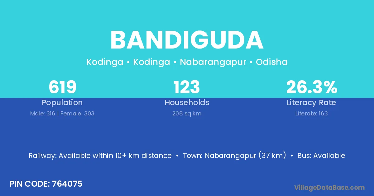 Sunabeda (32 km) is the nearest town to Bandiguda village for major economic activities and is located approximately 32 km away.
