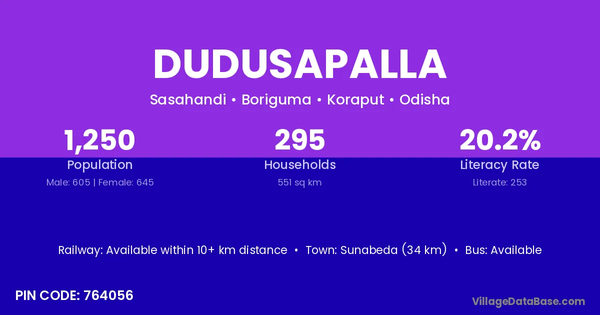 Sunabeda (34 km) is the nearest town to Dudusapalla village for major economic activities and is located approximately 34 km away.
