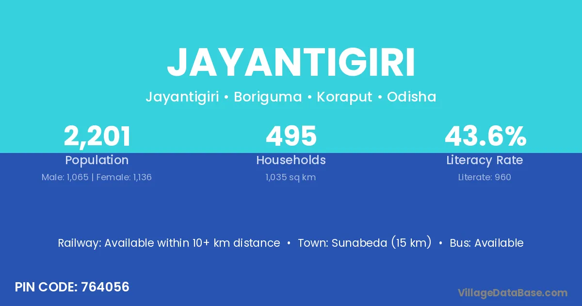 Sunabeda (15 km) is the nearest town to Jayantigiri village for major economic activities and is located approximately 15 km away.