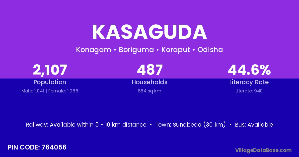 Sunabeda (30 km) is the nearest town to Kasaguda village for major economic activities and is located approximately 30 km away.