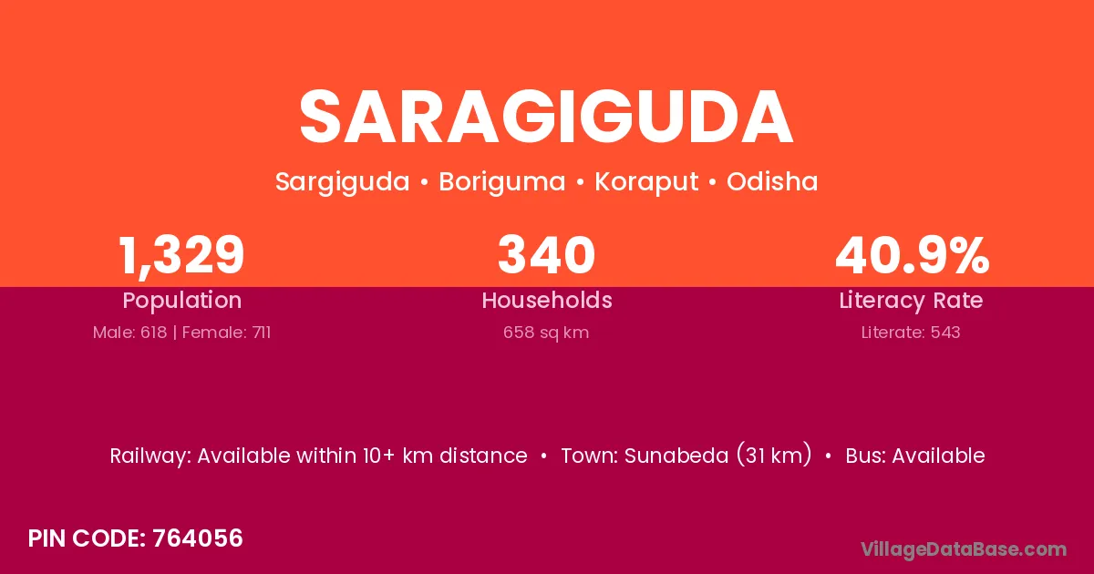 Sunabeda (31 km) is the nearest town to Saragiguda village for major economic activities and is located approximately 31 km away.