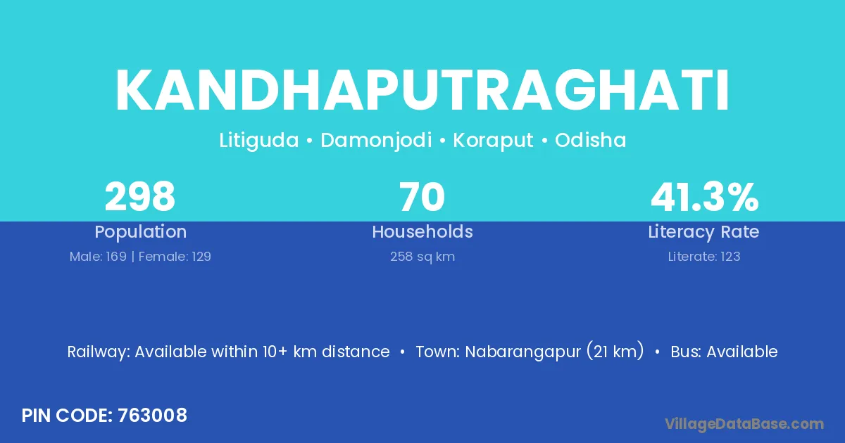 Nabarangapur (21 km) is the nearest town to Kandhaputraghati village for major economic activities and is located approximately 21 km away.