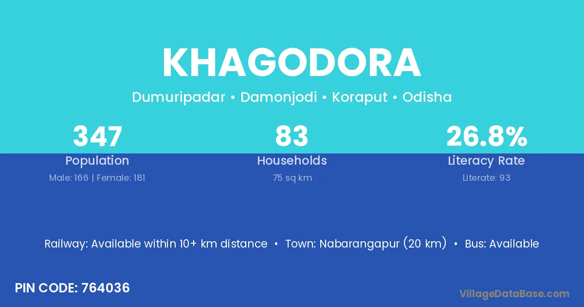 Nabarangapur (20 km) is the nearest town to Khagodora village for major economic activities and is located approximately 20 km away.