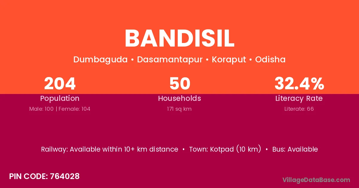 Kotpad (10 km) is the nearest town to Bandisil village for major economic activities and is located approximately 10 km away.