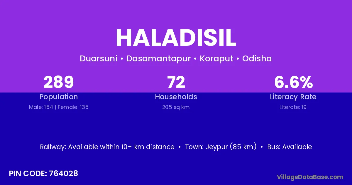 Jeypur (85 km) is the nearest town to Haladisil village for major economic activities and is located approximately 85 km away.