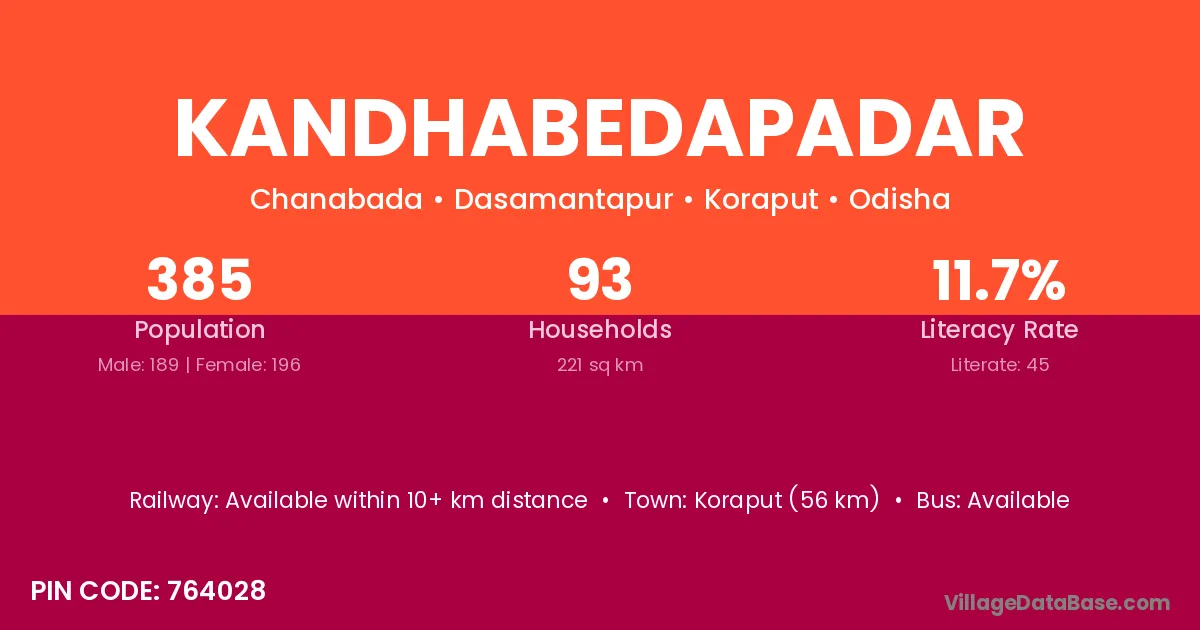 Kandhabedapadar village has a total population of 385 people, of which 189 are males and 196 are females.
