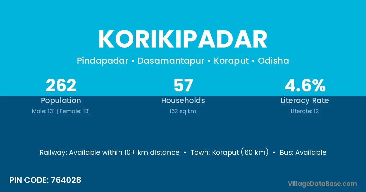 Koraput (60 km) is the nearest town to Korikipadar village for major economic activities and is located approximately 60 km away.