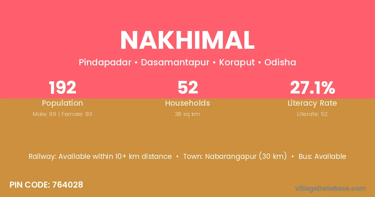 Nabarangapur (30 km) is the nearest town to Nakhimal village for major economic activities and is located approximately 30 km away.