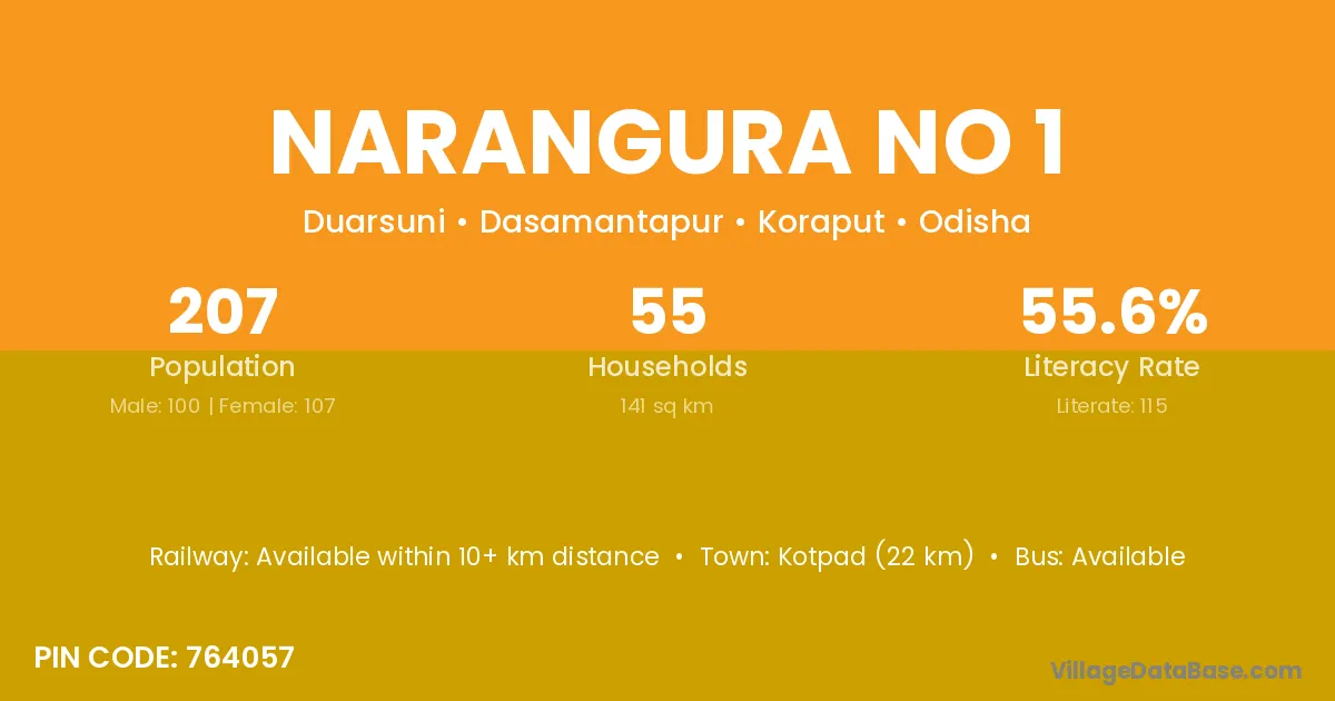 Kotpad (22 km) is the nearest town to Narangura No 1 village for major economic activities and is located approximately 22 km away.