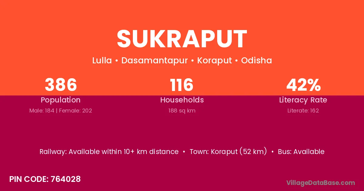 Sukraput village has a total population of 386 people, of which 184 are males and 202 are females.