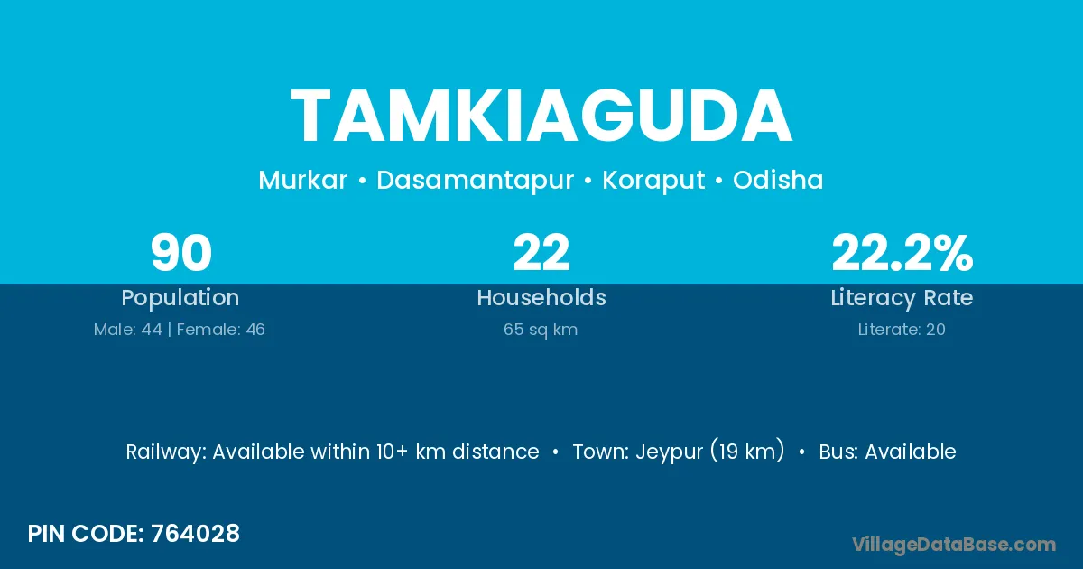Jeypur (19 km) is the nearest town to Tamkiaguda village for major economic activities and is located approximately 19 km away.
