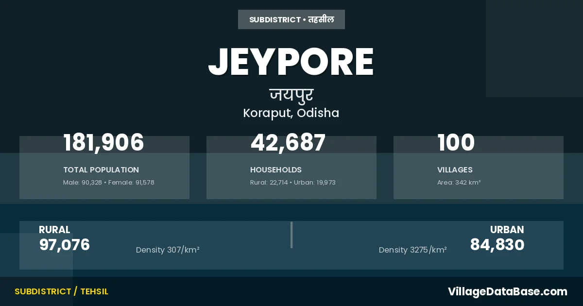 According to the 2011 census The total area of Jeypore Tehsil is 342 km², with a population of 181906 people. The population density is 532 inhabitants per square kilometre, and there are approximately 42687 houses in the sub district.