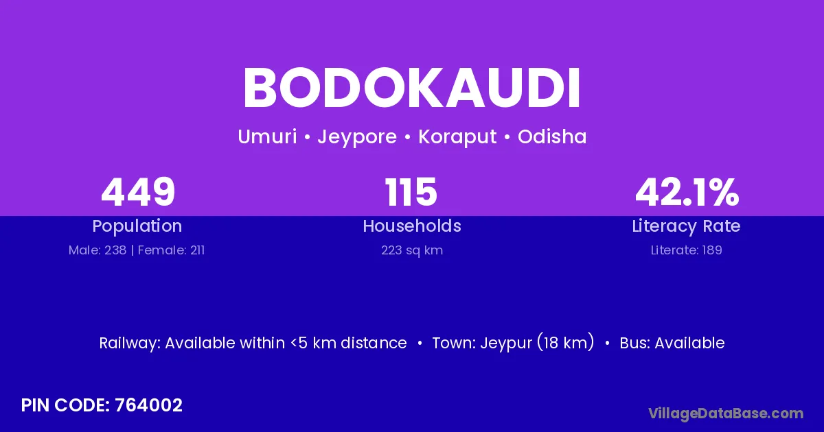 Jeypur (18 km) is the nearest town to Bodokaudi village for major economic activities and is located approximately 18 km away.