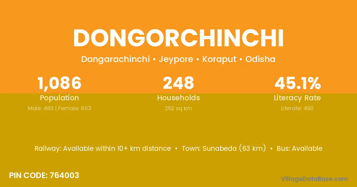 Sunabeda (63 km) is the nearest town to Dongorchinchi village for major economic activities and is located approximately 63 km away.