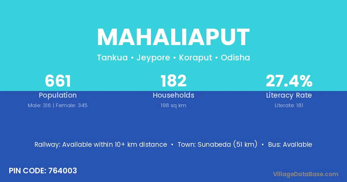 Sunabeda (51 km) is the nearest town to Mahaliaput village for major economic activities and is located approximately 51 km away.