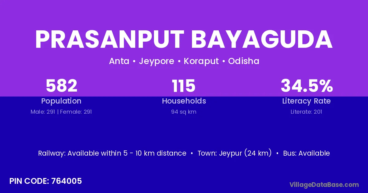 Prasanput Bayaguda village has a total population of 582 people, of which 291 are males and 291 are females.