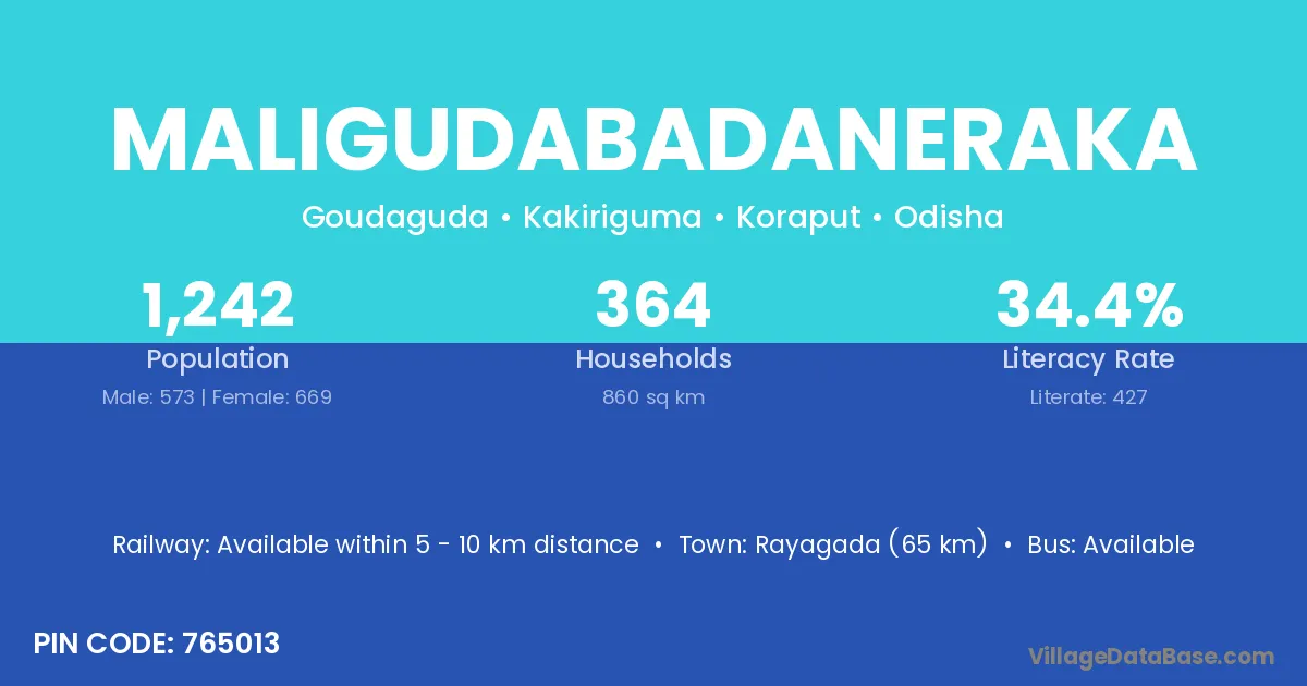 Rayagada (65 km) is the nearest town to Maligudabadaneraka village for major economic activities and is located approximately 65 km away.