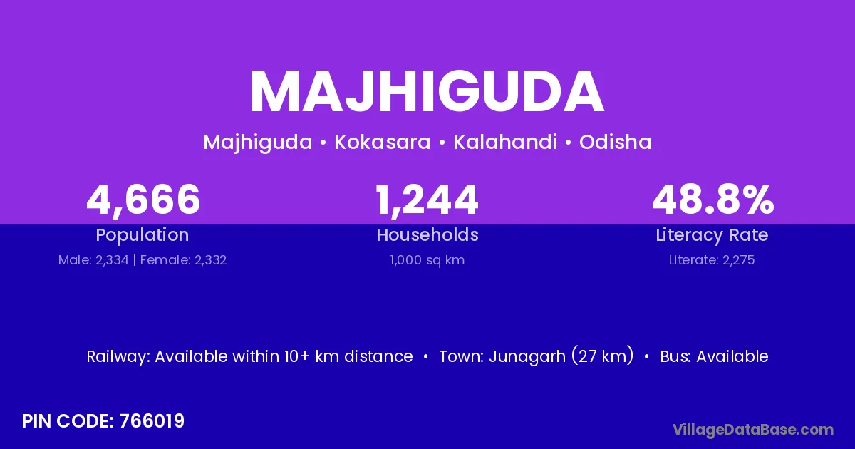 Rayagada (70 km) is the nearest town to Majhiguda village for major economic activities and is located approximately 70 km away.