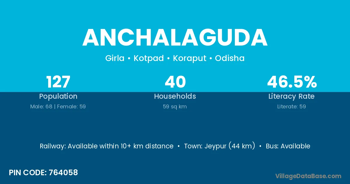 Jeypur (44 km) is the nearest town to Anchalaguda village for major economic activities and is located approximately 44 km away.