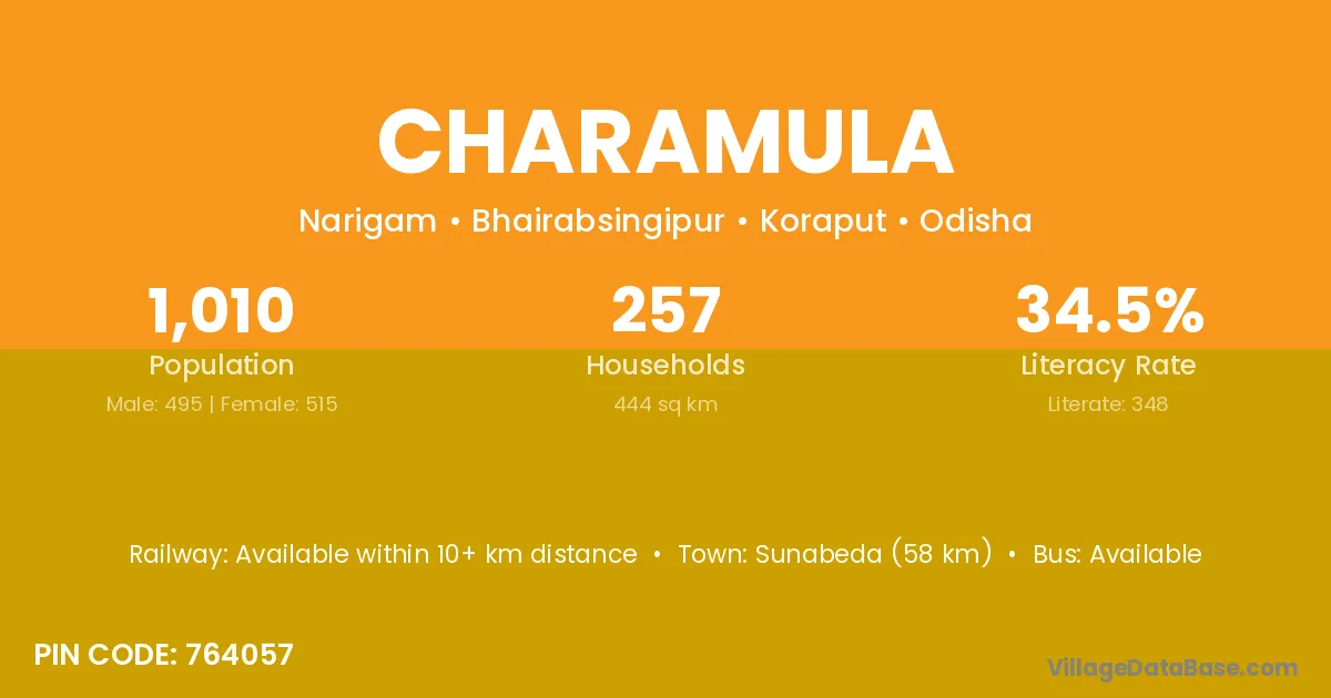 Sunabeda (25 km) is the nearest town to Charamula village for major economic activities and is located approximately 25 km away.