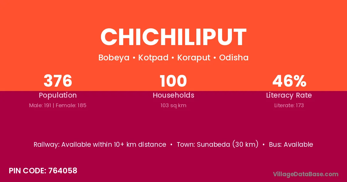Sunabeda (30 km) is the nearest town to Chichiliput village for major economic activities and is located approximately 30 km away.