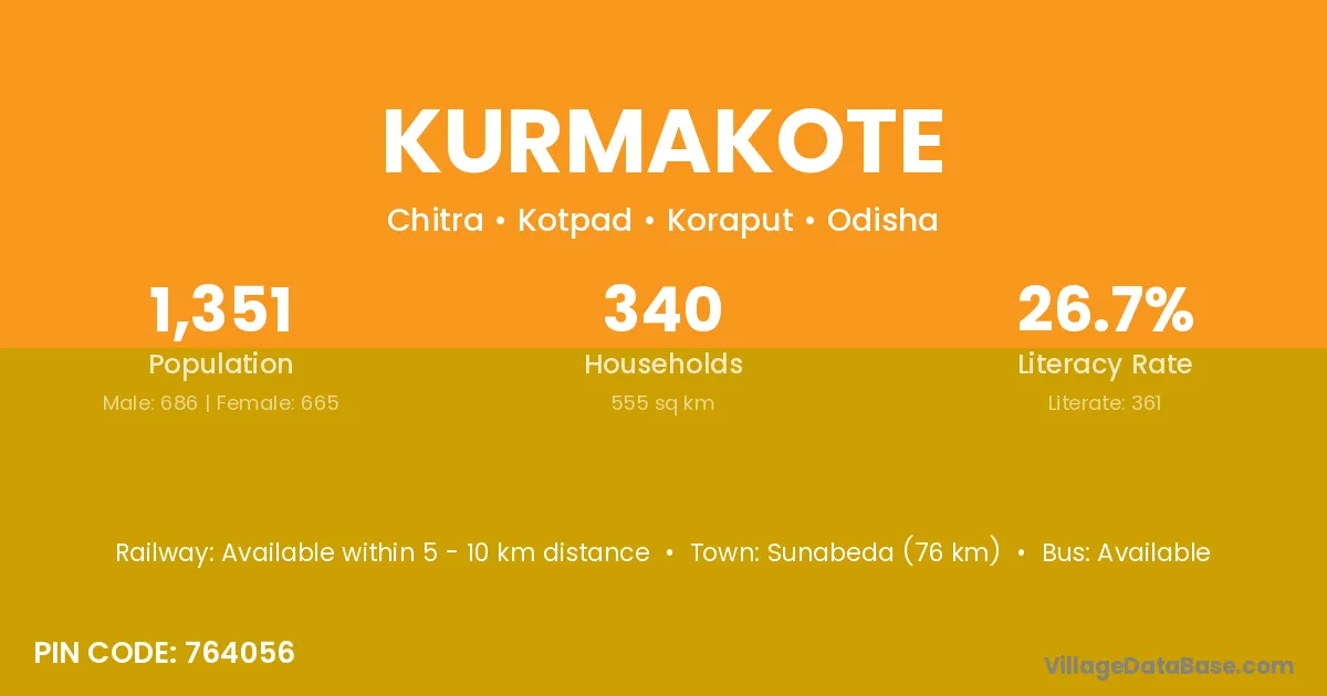 Sunabeda (76 km) is the nearest town to Kurmakote village for major economic activities and is located approximately 76 km away.
