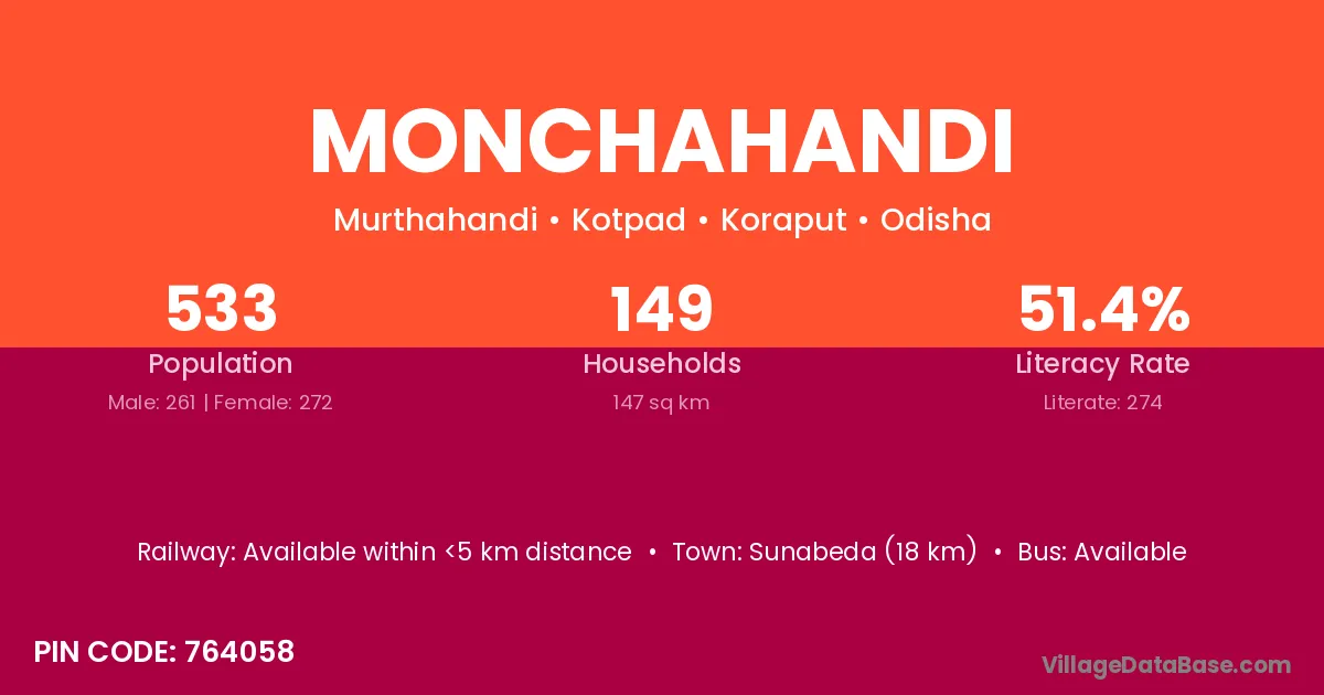 Sunabeda (18 km) is the nearest town to Monchahandi village for major economic activities and is located approximately 18 km away.