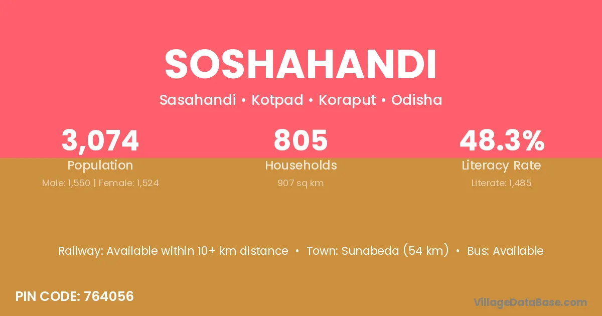 Soshahandi village has a total population of 3,074 people, of which 1,550 are males and 1,524 are females.