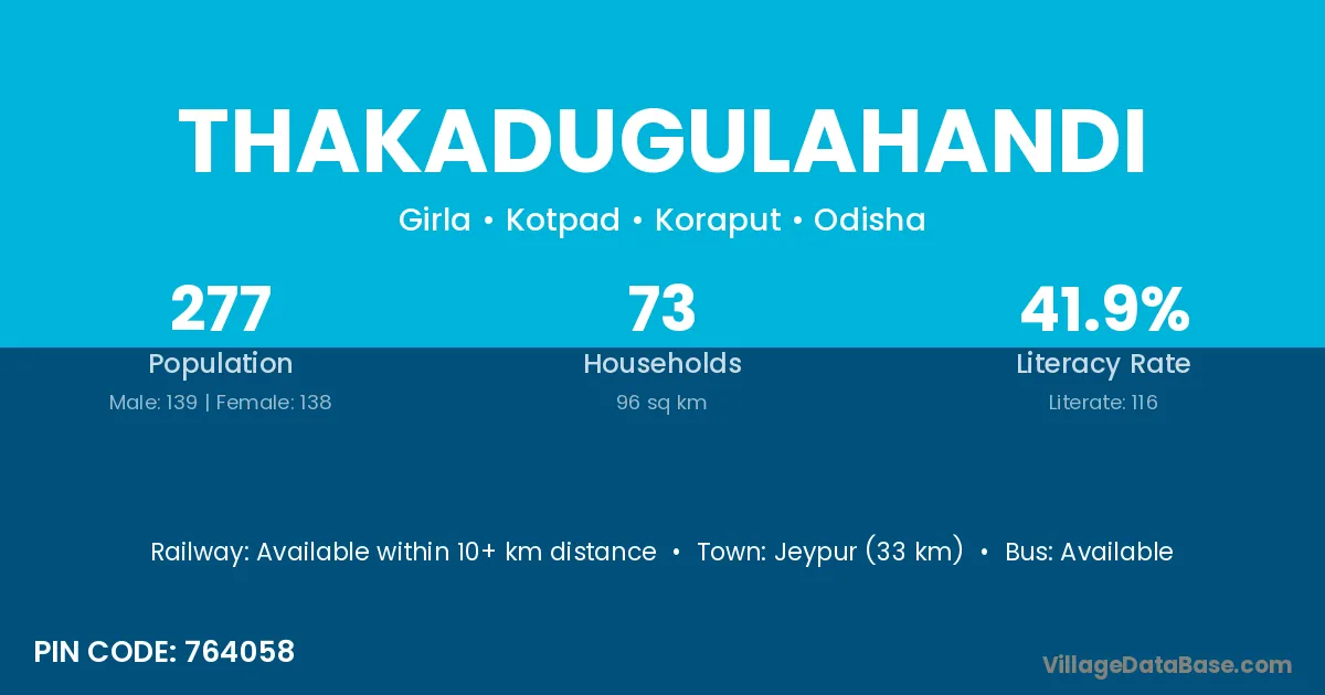 Jeypur (33 km) is the nearest town to Thakadugulahandi village for major economic activities and is located approximately 33 km away.