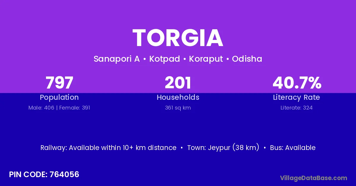 Jeypur (38 km) is the nearest town to Torgia village for major economic activities and is located approximately 38 km away.